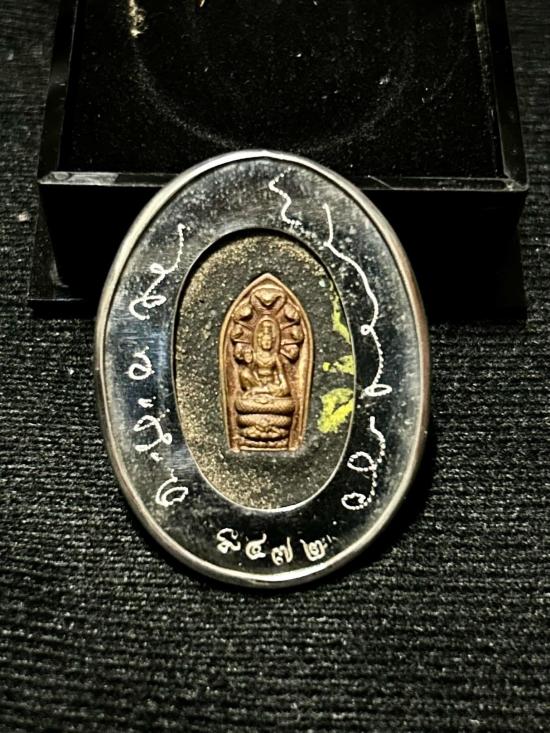 ล็อกเก็ต รุ่นนายพลเหนือดวงพร้อมเหรียญเลื่อนสมณศักดิ์ พิมพ์รูปไข่ เลี่ยมเงิน หลังอุดผงพรายกุมาร no. 472 ฝังปรกเบญจฤทธิ์ 1 องค์