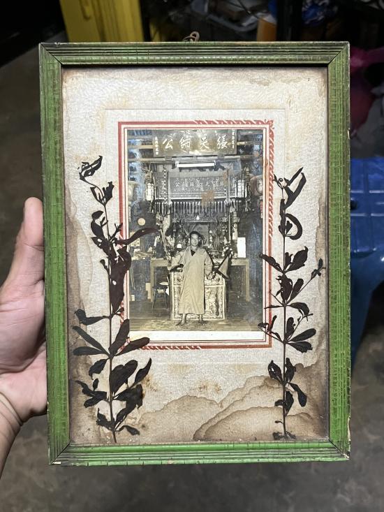 รูปศาลเจ้าจีนกับพระภิกษุจีน กำลังทำพิธี ไม่ทราบที่ กรอบเดิมๆ ปรอทเต็มใบ เข้มขลัง ราวปี2500+- เคาะเดียวแดง