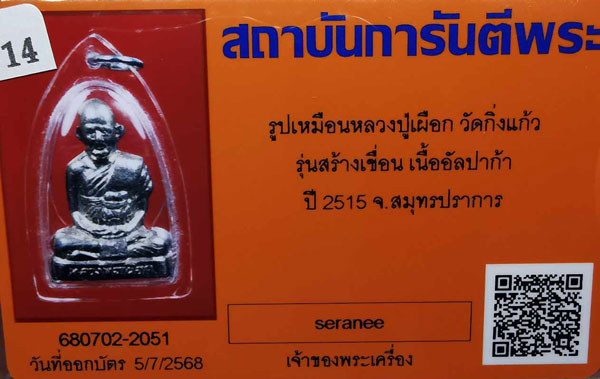 รูปเหมือนหลวงปู่เผือก วัดกิ่งแก้ว รุ่นสร้างเขื่อน เนื้ออัลปาก้า กริ่งดัง ปี2515 จ.สมุทรปราการ + บัตรG-pra สภาพสวยเดิมค่ะ สภาพตามรูปทุกประการค่ะ