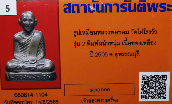 รูปเหมือนหลวงพ่อขอม วัดไผ่โรงวัว รุ่น2 พิมพ์หน้าหนุ่ม เนื้อทองเหลือง กริ่งดัง ปี2505 จ.สุพรรณบุรี + บัตรG-pra สภาพเดิมค่ะ |