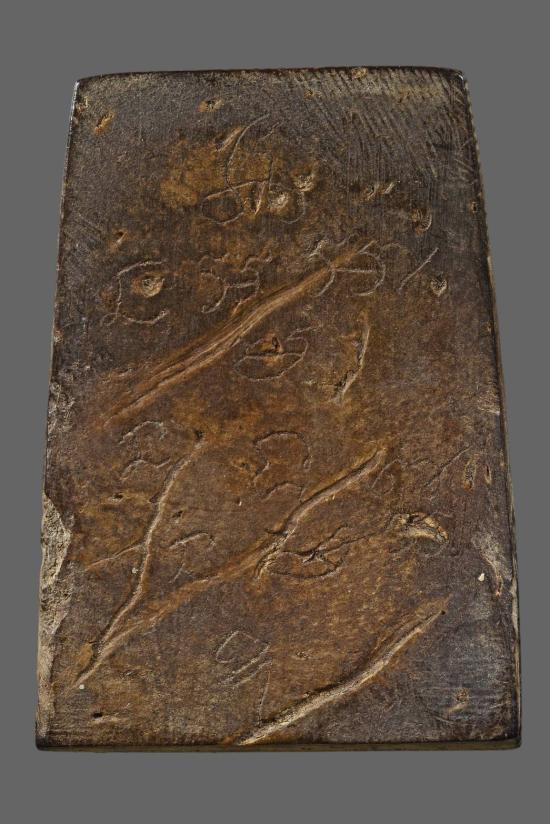 กะลาแกะพระพุทธเก่า ฐานสามชั้น หลังจารมือ ไม่ทราบที่