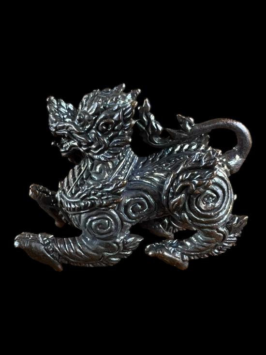 สิงห์เมตตามหาบารมี หลวงพ่อพูล วัดไผ่ล้อม จ.นครปฐม ปี2546 เนื้อนวโลหะแก่ทอง พร้อมกล่องเดิม |
