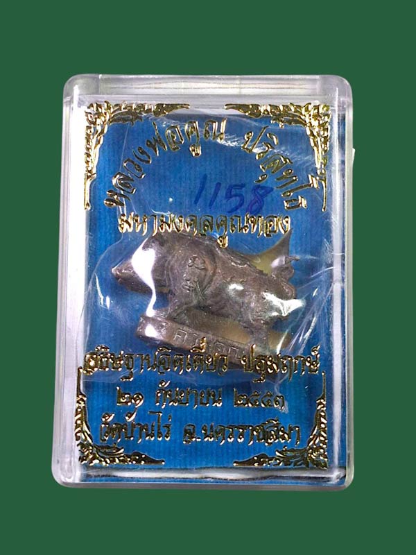 หมูคูณทองค้ำ คูณ หนุน นำ เนื้อทองแดงเถื่อน เลข1158 ใต้ฐานบรรจุผงพุทธคุณ,ผงยาฉุนที่เหลือจากรุ่นมงคลบารมี๓๘,เกสรดอกไม้เสกนาน๖ปี โรยหน้าด้วยเกศา.ลพ คูณ+ทอง ตะกรุดทองเหลือง,จีวรลพคูณ |
