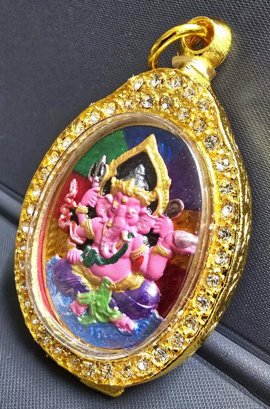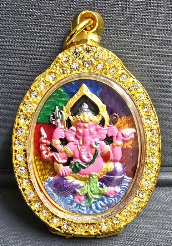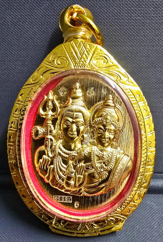เนื้อนวะโลหะ ชุบทองคำ 99.99% ลงยาพื้น 7 สี เพ้นองค์พระพิฆเนศ หลังเรียบ ติดตัดชิดพระศิวะชุบทองคำ