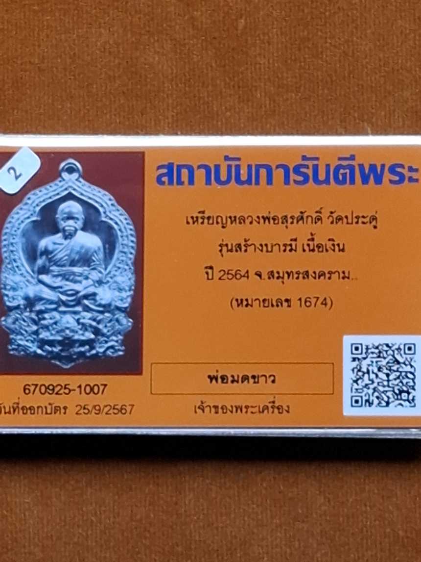 เหรียญนั่งพาน รุ่นสร้างบารมี พระมหาสุรศักดิ์ วัดประดู่พระอารามหลวง เนื้อเงิน กล่องเดิม พร้อมบัตรรับรองครับ