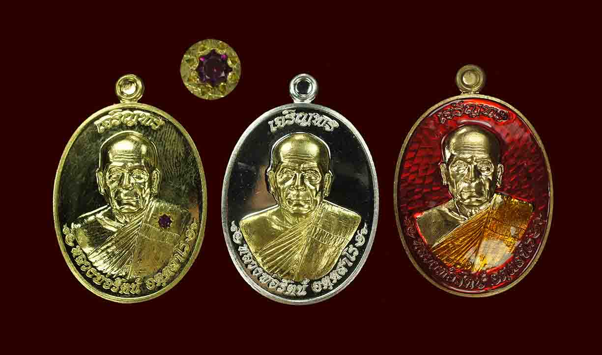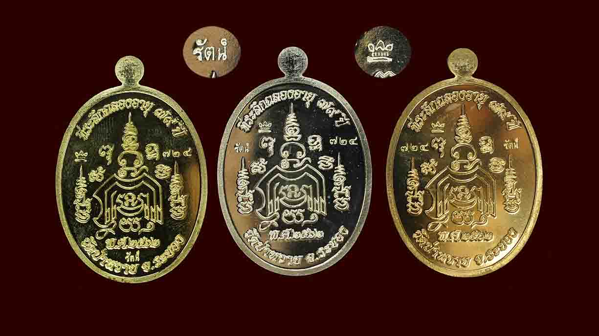 เหรียญเจริญพรบน รุ่น 69 ปี หลวงพ่อรัตน์ วัดป่าหวาย ระยอง ปี 2562 ชุดกรรมการ 3 เหรียญ สร้าง 799 ชุด หมายเลข 724 ( หมายเลขเดียวกันทั้งชุด ) พร้อมกล่องเดิมจากวัด