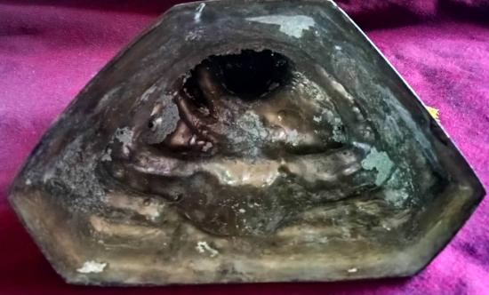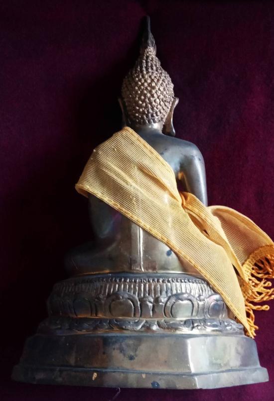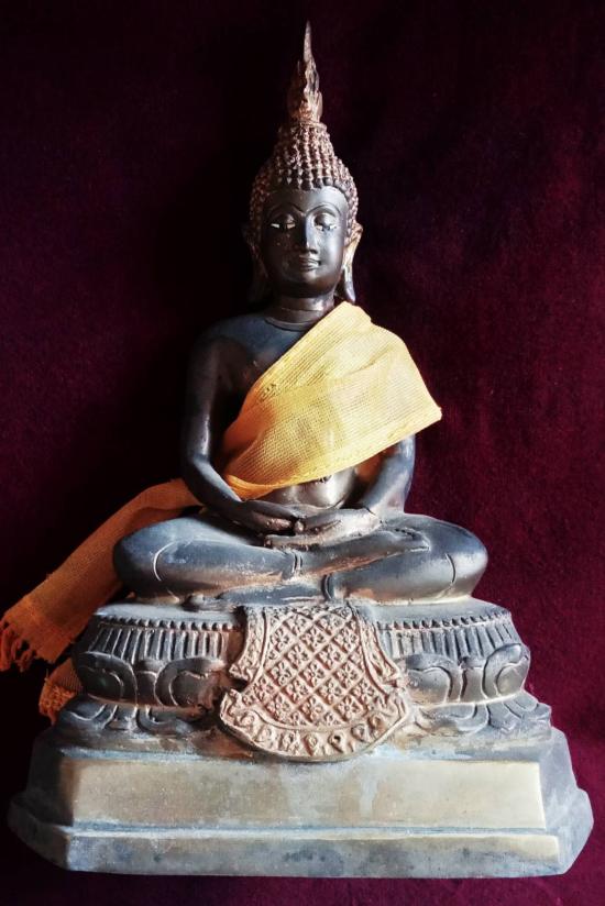 พระบูชา ปางตรัสรู้ ตามุกแท้ ขนาดหน้าตักประมาณ 4.5 นิ้ว ประทับนั่งบนผ้าทิพย์ ฐานบัวคว่ำบัวหงายงาม ๆ เนื้อทองเหลือง สีเริ่มออกคล้ำแดงดำ ใต้ฐานมองเห็นเศษดินฝรั่งและแกนลวดหุ่นพระในองค์พระ ดูเก่าดี ผูกผ้าเฉวียงบ่ามาแต่เดิม สภาพสวยตามรูป ส่งฟรีทั่วไทย รับประกันตามกฎครับ |