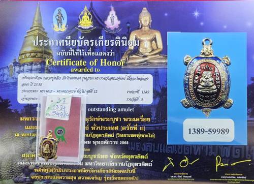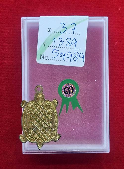เหรียญเต่าเรือน หลวงปู่หลิว วัดไร่แตงทอง รุ่นบูรณะพระราชวังสนามจันทร์ เนื้อกะไหล่ทองลงยา ปี2538 ติดรางวัลที่3 |