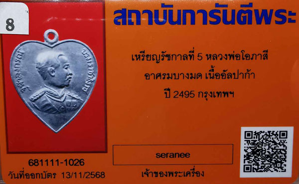 เหรียญรัชกาลที่5 หลวงพ่อโอภาสี อาศรมบางมด พิมพ์รูปหัวใจ เนื้ออัลปาก้า ปี2495 จ.กรุงเทพฯ + บัตรG-pra สภาพเดิมค่ะ |