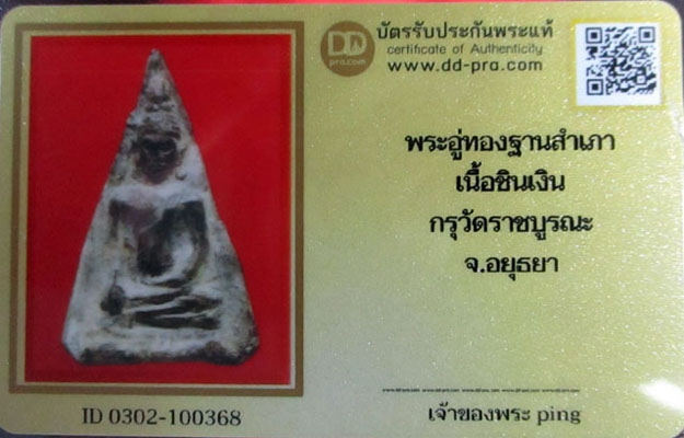 ชื่อพระเครื่อง พระอู่ทองฐานสำเภา เนื้อชินเงิน กรุวัดราชบูรณะ จ.อยุธยา บัตรรับรองเว็ป dd