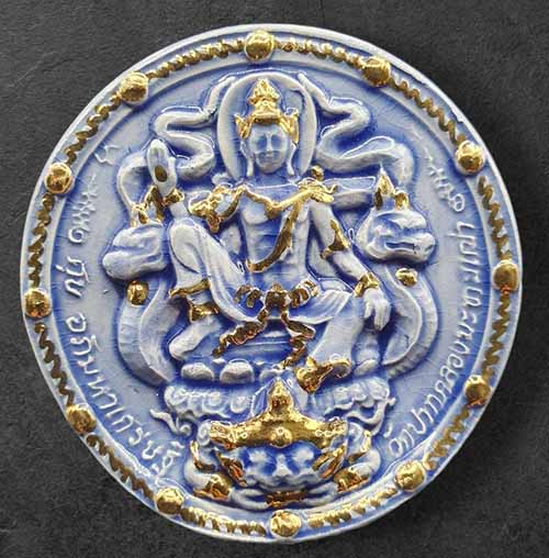 องค์พ่อจตุคาม หลวงปู่ศุข กรมหลวงชุมพร รุ่น ศุข อภิมหาเศรษฐี เนื้อกระเบื้องเคลือบ สีน้ำเงิน + สีเหลือง ลายน้ำทอง ขนาด 5 ซม และ 3 ซม.กล่องเดิม |