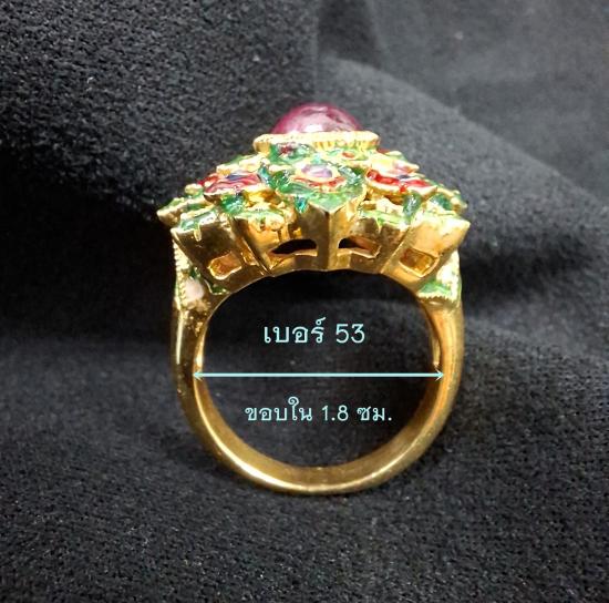 แหวนเงินแท้ 92.5 ตัวเรือนงานขึ้นมือ - ชุบทอง ลงยา - หัวแหวนทับทิม เม็ดล้อมทับทิม - ทรงแก้วเจ้าจอม - ขนาด 53 |