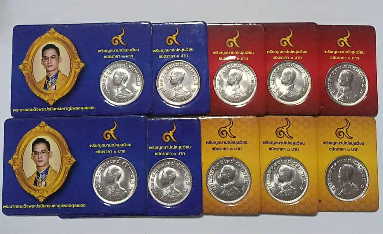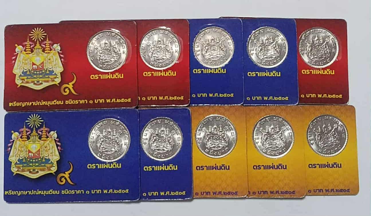 เหรียญ 1 บาท หลังตราแผ่นดิน พ.ศ.2505 ในสมัย รัชกาลที่ 9 พร้อมการ์ดสีแดง,สีน้ำเงิน,สีเหลือง เหรียญสภาพไม่ผ่านการใช้งาน ผ่านล้างสวย จำนวน 10 เหรียญ ครับ