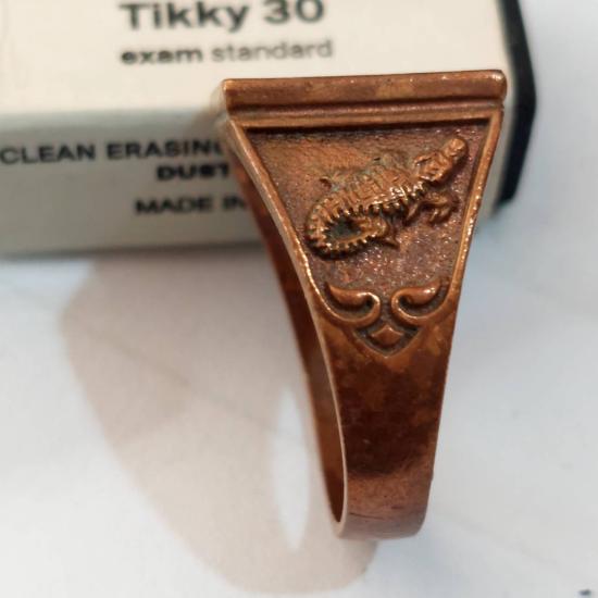 แหวนยันต์ตรีนิสิงเห ใต้ท้องแหวนหมูทองแดง วัดเขากะโหลก ปราณบุรี เนื้อทองแดง มีประสบการณ์ ขนาด 2.0 ซม. |