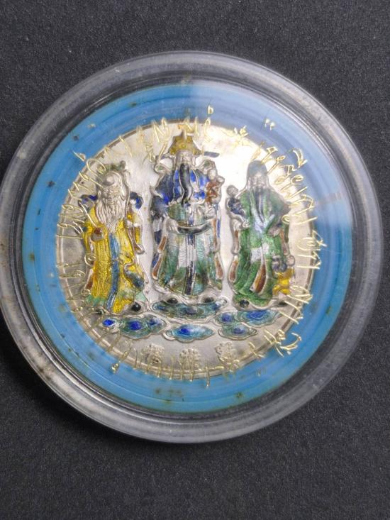 เหรียญเงินลงยา ฮก,ลก,ซิ่ว รุ่นสร้างอุโบสถวัดนก ปี2539 ขนาดประมาณเหรียญสิบบาท พร้อมตลับเดิมมีโค๊ตและหมายเลข3465