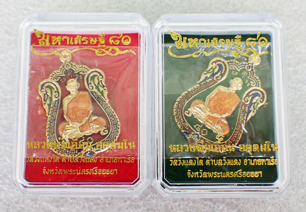 $เคาะแรกเบาวัดใจทีเดียว 2 องค์ค่ะ เหรียญเสมา รุ่น มหาเศรษฐี ๘๐ หลวงพ่อเอื้อน วัดวังแดงใต้ จ.พระนครศรีอยุธยา เนื้อกะไหล่ทองลงยาสีแดง เลข ๑๐๓๔ + เนื้อกะไหล่ทองลงยาสีเขียว เลข ๕๖๓ พร้อมกล่องเดิมค่ะ$ |