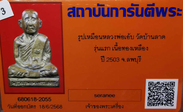 รูปเหมือนหลวงพ่อเอ้บ วัดบ้านลาด รุ่นแรก เนื้อทองเหลือง ปี2503 จ.ลพบุรี + บัตรG-pra สภาพเดิมค่ะ |