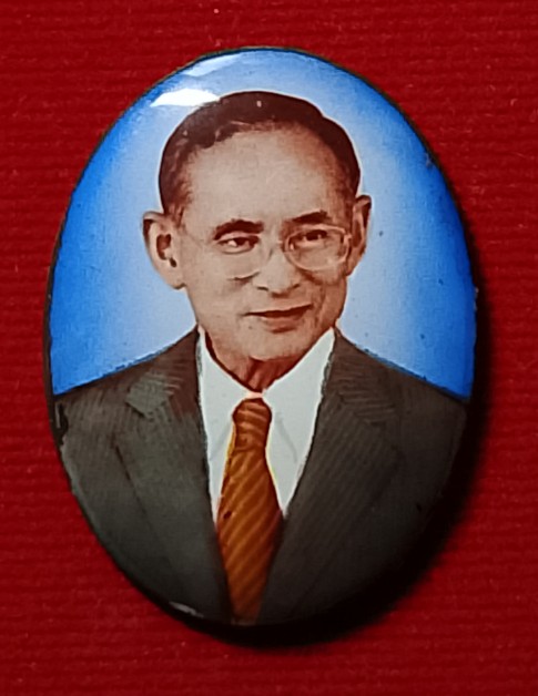 ด้านหน้าเป็นพระบรมรูปในหลวงรัชกาลที่ 9 ทรงสูทแบบสากล, ด้านหลังปิดด้วยแผ่นทองคำ เงิน หรือโลหะ และบรรจุมวลสารมหามงคล