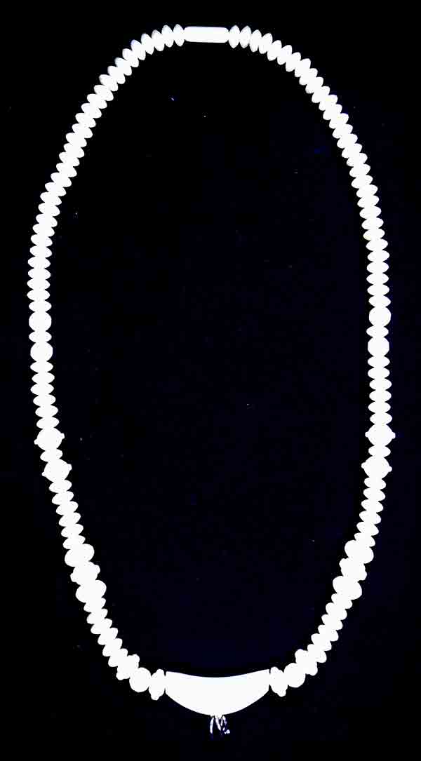 สร้อยคอกระดูกช้าง ( คล้องพระได้ 1 องค์ ) ตรงกลางเป็นสามเหลี่ยมบูมเมอแรง ขนาดความยาวทั้งเส้น 25 นิ้ว กระดูกเม็ดขนาด 9 ม.ม.หนา 4 ม.ม. ใช้เป็นสร้อยแขวนพระมงคล สวมคอได้สบายๆ ตามรูป |