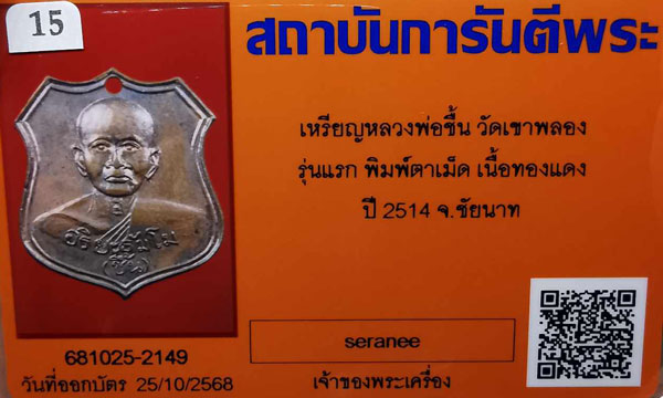 เหรียญหลวงพ่อชื้น วัดเขาพลอง รุ่นแรก พิมพ์มีเม็ดตา เนื้อทองแดง ปี2514 จ.ชัยนาท + บัตรG-pra สภาพเดิมค่ะ |