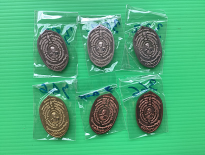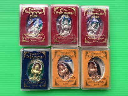 เหรียญท้าวมหาพรหม รุ่น ชนะมาร หลวงปู่สอ วัดบ้านขาม จ.สุรินทร์ เนื้ออัลปาก้าลงยา 3 เหรียญ , เนื้อทองฝาบาตรลงยา 1 เหรียญ , เนื้อทองแดงลงยา 2 เหรียญ กล่องเดิม |