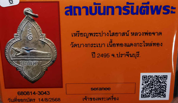 (วันอังคาร)เหรียญพระปางไสยาสน์ หลวงพ่อจาด วัดบางกระเบา เนื้อทองแดงกะไหล่ทอง ห่วงเดิม ปี2495 จ.ปราจีนบุรี + บัตรG-pra สภาพเดิมค่ะ |