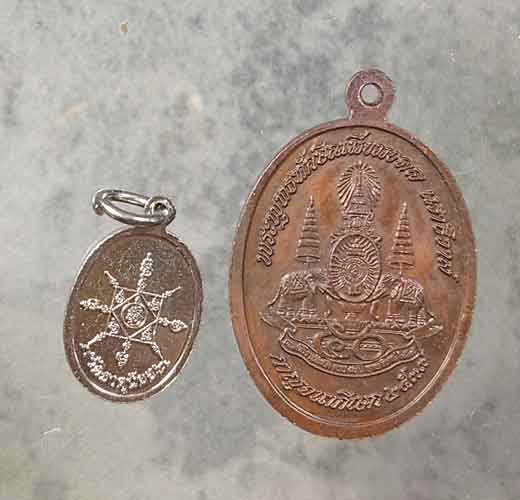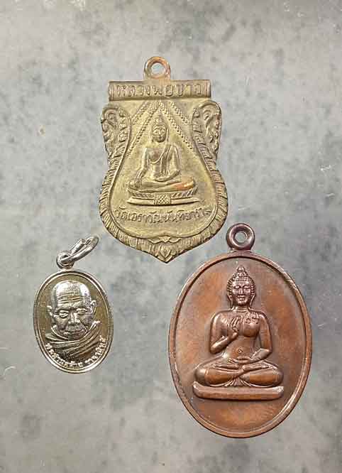 เหรียญหลวงพ่อขาว วัดเอราวัณนันทิยาราม จ.ชุมพร มีจาร + เม็ดแตงพ่อท่านคล้าย + เหรียญพระพุทธทักษิณมิ่งมงคล วัดเขากง จ.นราธิวาส ปี2539 |
