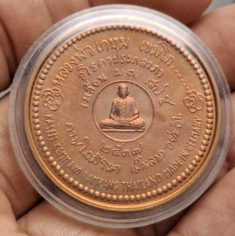 เหรียญ ม.ต. เสาร์ห้า หลวงพ่อเกษม เขมโก รุ่นเสาร์ห้ามหามงคล (บล็อกเยอรมัน) เนื้อทองแดงขัดเงาพิเศษ พิธีอธิษฐานจิตปลุกเสก วันเสาร์ 30 เมษายน 2537 หลวงพ่อเกษม เขมโก ได้อนุญาตให้จัดสร้างเป็นกรณีพิเศษ โดยอนุญาตให้เป็นภาษาไทยและอังกฤษ ซึ่งแสดงถึงความตั้งใจในการจัดสร้างวัตถุมงคลชุดนี้ เหรียญรุ่นนี้เป็น (บล็อกนอก) ประเทศเยอรมันนี สุดยอดปฏิมากรรมของโลก ล้ำหน้าด้วยเทคโนโลยีใหม่สุด ด้วยรูปแบบที่สวยงาม ทั้งนี้เพื่อสู่ความเป็นเลิศในการสร้างเหรียญ ผลิตและออกแบบโดยโรงกษาปณ์ของรัฐบาลประเทศเยอรมัน ซึ่งเป็นปฏิมากรรมชิ้นโบแดงชิ้นแรกของยุโรป ที่นำมาสู่ประเทศไทยเป็นครั้งแรก จัดสร้างโดยสำนักสุสานไตรลักษณ์ จ.ลำปาง หลวงพ่อเกษม เขมโก