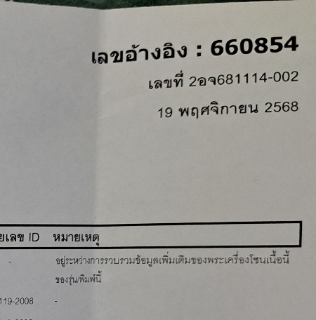พระองค์นี้นำไปออกบัตรรับรองแล้วผลคือพระเนื้อนี้ยังอยู่ในช่วงสะสมข้อมูลไม่สามารถเอาบัตรได้ แต่ไม่ปลอมนะครับถ้าปลอมทางบริษัทจะระบุเลยว่าพระไม่แท้ |
