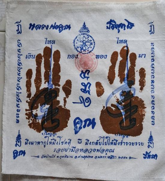 มาคู่ ผ้ายันต์ รอยมือ + รอยเท้า หลวงพ่อคูณ ปริสุทโธ วัดบ้านไร่ นครราชสีมา ปั๊มตราวัด ปี 2551 เเบบสกรีน ( พร้อมรอยจารหลวงพ่อทองศิษย์หลวงพ่อคูณ วัดบ้านไร่ เมตาจารหมึกให้ครับ )