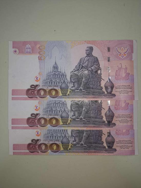 ธนบัตรรักาลที่ 9 ไม่ผ่านการใช้ ฉบับละ 500 บาท รวม 3 ฉบับ ตามรูปเคาะเดียว