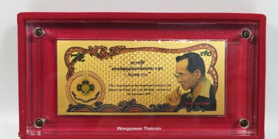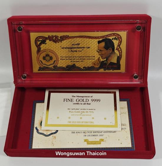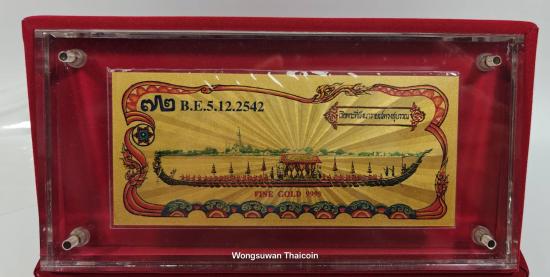 ตราสารทองคำมหามงคลเฉลิมพระเกียรติ 72 พรรษา "พระราชพิธีมหามงคลเฉลิมพระชนมพรรษา 6 รอบ 5 ธันวาคม 2542" และภาพเรือพระที่นั่งนารายณ์ทรงสุบรรณ รัชกาลที่9 ประดิษฐานบนแผ่นทองคำบริสุทธิ์ 99.99% แบบ3มิติ |