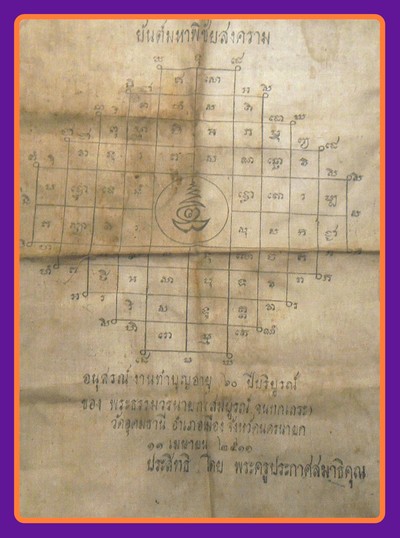 120-ผ้ายันต์มหาพิชัยสงคราม วัดอุดมธานี พศ.2511 ประสิทธิโดย พระครูประกาศสมาธิคุณ ขนาดประมาณ 8.5 x11.5" |