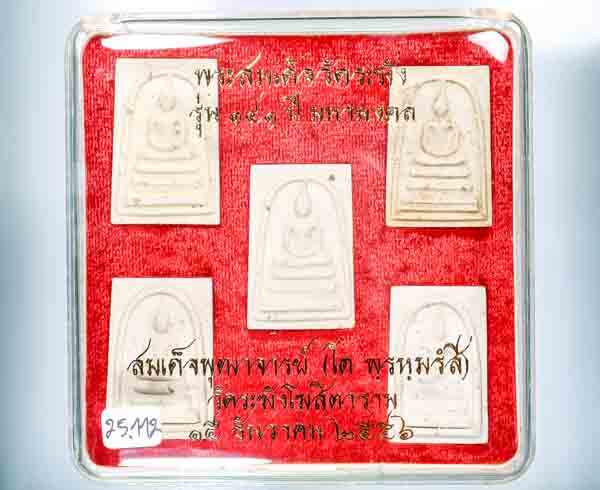 กล่องเป็นกล่องเดิมชุดกรรมการเล็ก ซึ่งประกอกด้วย พิมพ์ใหญ่เกศทะลุซุ้ม(ประทาน) พิมพ์ใหญ่(ประทาน) พิมพ์เส้นด้าย พิมพ์เกศบัวตูม และพิมพ์ฐานแซม แต่จะเป็นเนื้อแตกลายงา แต่ในชุดนี้ ได้เอาพระชุดโรยผงเก่า มาใส่ในกล่อง กรรมการเล็ก เอาไปแจกของขวัญปีใหม่ ราคาเบาๆ