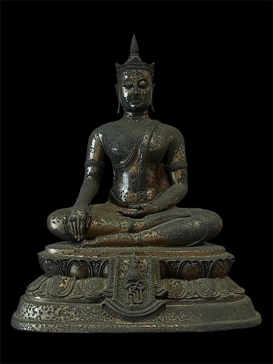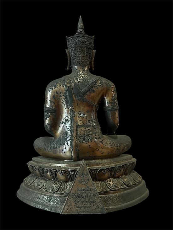 พระพุทธชัยรังสี สธ. รวมดวงใจเพื่อสายใจไทย ณ วัดป่าชัยรังสี จังหวัดสมุทรสาคร ปี พ.ศ.2532 พิธีใหญ่ เนื้อโลหะผสม รมดำ ผิวหิ้ง