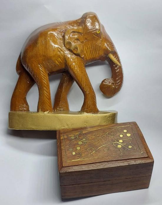ตลับไม้เล็กขนาด 2*3 นิ้ว กับ ช้างแกะสลักไม้สัก สูง 4 นิ้ว |
