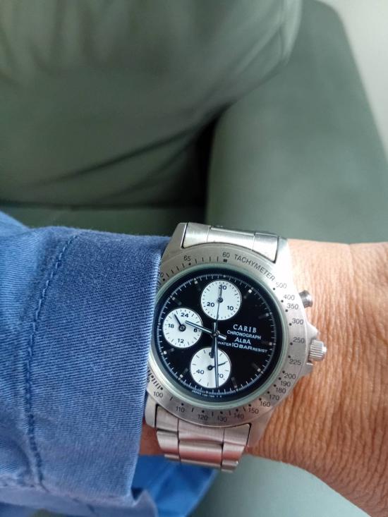 นาฬิกา ALBA CRONOGRAPH หน้า panda MADE IN JAPAN ขนาด 40 มม ระบบควอทซ์ สายนาฬิกาเหล็ก ยาว 18 ซม ข้อใหญ่ใส่ได้ นาฬิกาเดินปกติ ขอบบาเซิลสวยเดิม