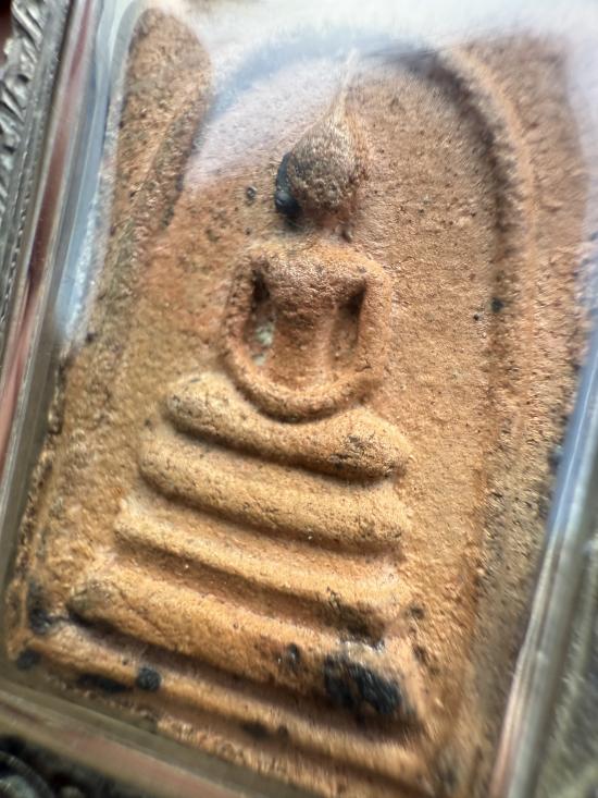 ด้านหลังคราบสีดำๆ ที่ปรากฎคือ ผงตะไบพระกริ่งวัดสุทัศน์ ที่ผสมอยู่ในเนื้อพระ เมื่อนำพระพิมพ์ไปเผาไฟ ผงตะไบจึงละลายออกมาคลุมผิวพระอย่างที่เห็น
