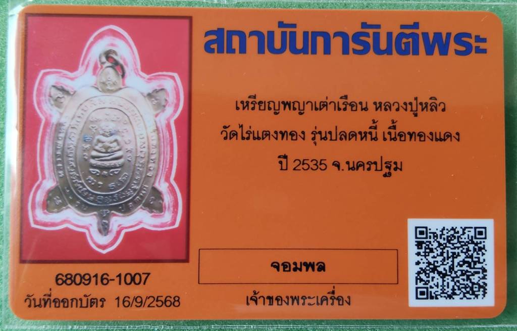 รายละเอียด เหรียญพญาเต่าเรือนหลวงปู่หลิว เหรียญพญาเต่าเรือน หลวงปู่หลิว ปลดหนี้รุ่นแรก ปี2535 เนื้อทองแดง จมูกโด่งๆ โค๊ตยาว >นิยมสุด เลี่ยมรักษาผิว + พร้อมบัตรรับรอง พึ่งออกมาสดๆร้อนๆเลยครับ ผิวสวยๆแดงๆ เจอแบบนี้ต้องรีบเก็บครับ บรรยด้วยภาพรับประกัตามกฏ ยังมีพระอีกหลายรายการกดเข้าดูที่รูปฆ้อนได้เลยครับเผื่อมีพระที่ท่านกำลังตามหาอยู่ครับ (กรณีพระมีบัตร ถ้าต้องการเปลี่ยนออกบัตรใหม่เพิ่ม 450 บาท ไม่มีส่วนลดนะครับ) รับประกันตามกฏทุกประการ