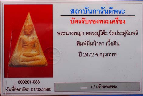 พระนางพญา หลวงปู่โต๊ะ วัดประดู่ฉิมพลี พิมพ์มีหน้าตา เนื้อดิน ปี 2472 จ.กรุงเทพ พร้อมบัตรรับรองสถาบันการันตีพระ