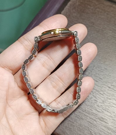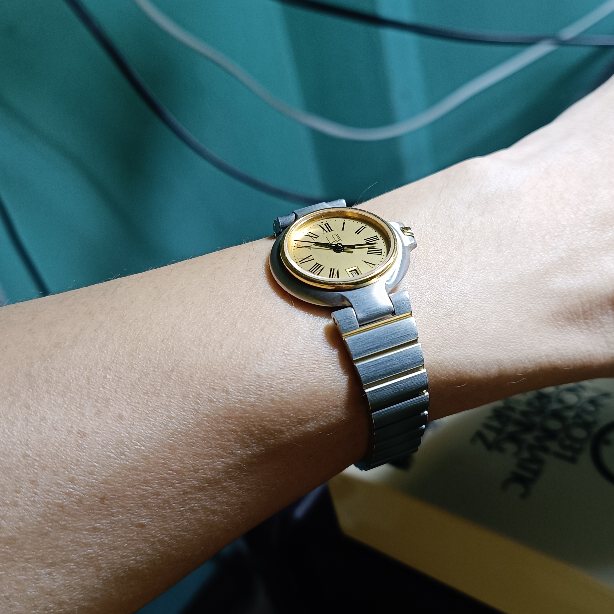 นาฬิกาเรือนนี้เป็นสไตล์วินเทจยุค 1980-1990 ขับเคลื่อนด้วยระบบQuartz ด้วยกลไกเครื่องswissแท้ 956112 movement หน้าปัดสีทอง ตัวเลขโรมันสีดำ มีช่องบอกวันที่ที่ตำแหน่ง6น. ตัวเรือนสองกษัตริย์ หรูหรา สวยงาม ให้ความคลาสสิค มองไกลๆยังรู้ว่าเป็นของมีระดับ ขนาดตัวเรือน 28 มิล รวมมะยม