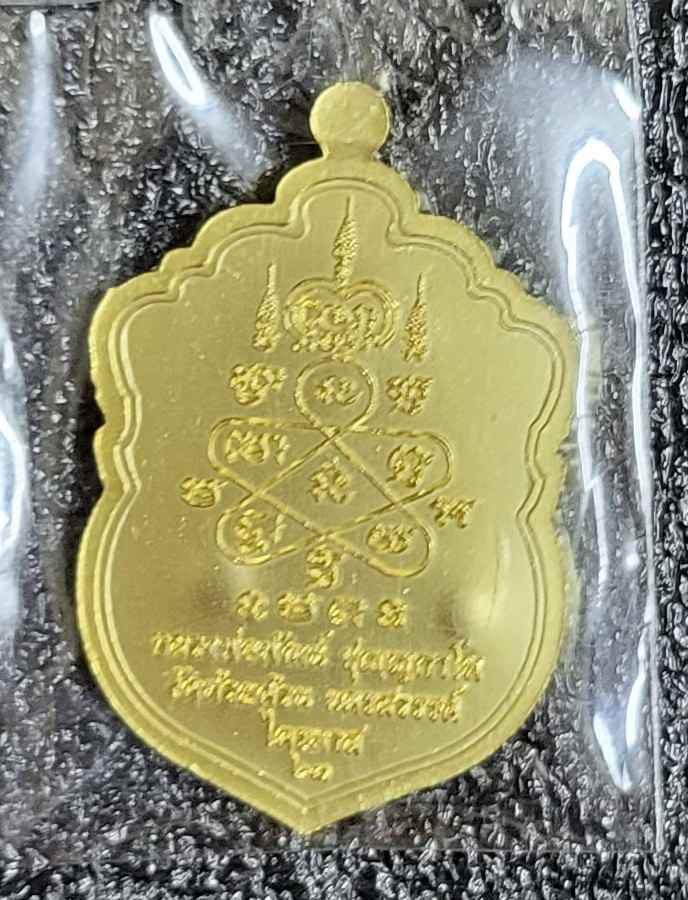เคาะเดียวแดง เหรียญหลวงพ่อพัฒน์ รุ่นไตรมาส 63 พิมพ์เสมาคาบแก้ว เนื้อชุบทองโบราณ |