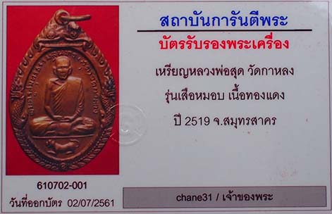 เหรียญหลวงพ่อสุด วัดกาหลง รุ่นเสือหมอบ เนื้อทองแดง ปี 2519 จ.สมุทรสาคร พร้อมกล่องเดิมและบัตรรับรองสถาบันการันตีพระ รับประกันตามกฏ G พระ ทุกประการครับ