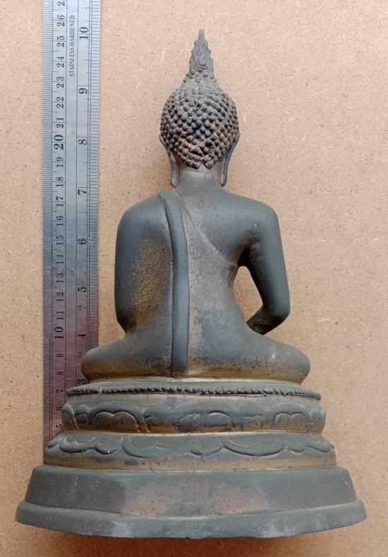 พระบูชา ปางมารวิชัย เนื้อโลหะ ฐานกว้าง 7 นิ้ว สูง 10 นิ้ว ใต้ฐานมีรอยตราปั้มวัด แต่ซีดจาง ตามรูป