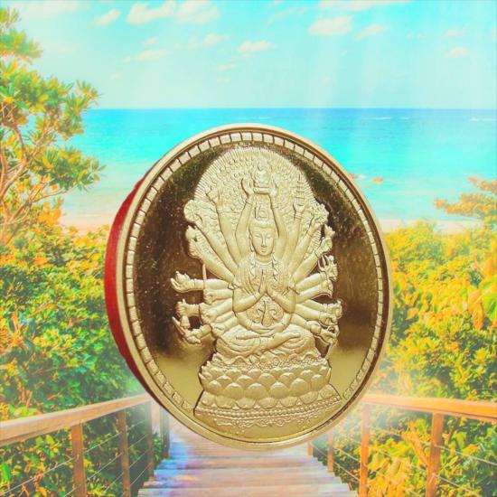 ด้านหลังเหรียญเจ้าแม่กวนอิมปางขี่มังกร หรือปางเหยียบมังกร (บางครั้งเรียกว่าปางประทานพรเหยียบมังกร) เป็นสัญลักษณ์แทนความมงคล ความสำเร็จ และความร่มเย็นเป็นสุข เชื่อกันว่าการบูชาปางนี้จะช่วยปัดเป่าสิ่งชั่วร้าย ปกป้องคุ้มครองจากภัยอันตราย เสริมเรื่องความเจริญรุ่งเรือง เลื่อนยศเลื่อนตำแหน่ง และนำมาซึ่งความสำเร็จในทุกด้าน พุทธคุณดังกล่าวมา ยิ่งช่วงนี้ถือศีลกินเจแล้วได้เหรียญเจ้าแม่กวนอิมไปบูชาเสริมดวงด้านการเงิน การงาน การเรียน และความรักให้ประสบผลสำเร็จทันตาเห็นด้วยการปฏิบัติทานเจเจ้าแม่กวนอิมจะให้พรเป็นมงคลแก่ผู้ปฏิบัติให้เห็นผลทันตาเลยครับ มีเหรียญเดียวนะครับ
