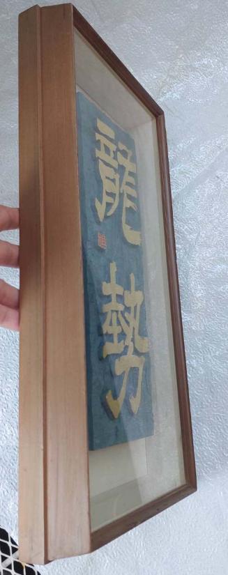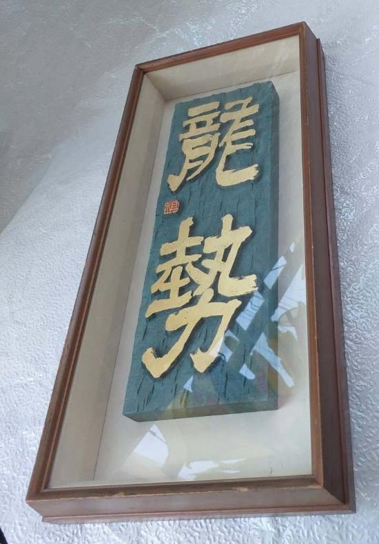 รายละเอียด กรอบแสดงการประดิษฐ์ตัวอักษรจีน (พู่กันจีน) คำว่า "龍勢" (ออกเสียงว่า "หลงซื่อ" ในภาษาจีนกลาง) ซึ่งมีความหมายว่า "พลังอำนาจของมังกร" หรือ "กระแสพลังมังกร" ซึ่งมักใช้เพื่ออวยพรให้ประสบความสำเร็จหรือมี