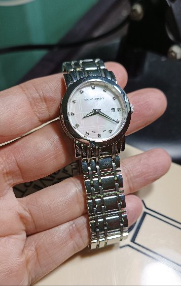 นาฬิกาเรือนนี้หน้าปัดเป็นมุกและเป็นลายตาราง burberry check ที่พื้นผิวเห็นแล้วรู้ทันทีว่าเป็นแบรนด์ burberry ดีไซน์เรียบหรู แฝงด้วยกลิ่นอายแฟชั่นของประเทศอังกฤษ สามารถใส่ลำลอง หรือใส่ออกงานก็ได้ หน้าปัดเปลี่ยนสีได้ตามมุมตกกระทบของแสง ส่วนหลักชั่วโมงประดับเพชรเล็ก สวยงามมากๆ ขนาดตัวเรือน 28 มิล รวมมะยมเป็น30มิล ขนาดกำลังใส่สวย ไม่เล็กหรือไม่ใหญ่จนเกินไป ตัวเรือนสตีลแท้ บานพับชนิดกดสปริงด้านข้าง ขนาดข้อมือไม่เกิน 17 ซม. ใส่ได้