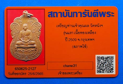 เหรียญท่านเจ้าคุณผล วัดหนังฯ รุ่นแรก เนื้อทองเหลือง ปี 2509 จ.กรุงเทพ พร้อมบัตรรับรองสถาบันการันตีพระ รับประกันตามกฎ G พระ ทุกประการครับ