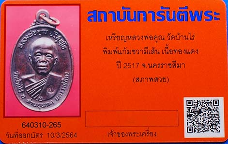 เหรียญหลวงพ่อคูณ วัดบ้านไร่ พิมพ์แก้มขวามีเส้น เนื้อทองแดง ปี 2517 จ.นครราชสีมา พร้อมบัตรรับรองการันตีพระ ระบุ (สภาพสวย)