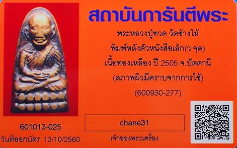 พระหลวงปู่ทวด วัดช้างให้ พิมพ์หลังตัวหนังสือเล็ก (ว จุด) หน้าหนู หูกาง เนื้อทองเหลือง ปี 2505 จ.ปัตตานี พร้อมบัตรรับรองสถาบันการันตีพระ รับประกันตามกฎ G พระ ทุกประการครับ